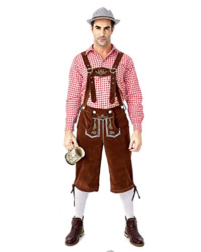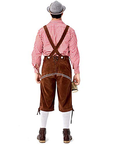 Klederdrachtbroek voor heren, korte lederhose met bandjes, geruit hemd, hoed voor Oktoberfest, rode shirts + bruine Dungarees, 2XL