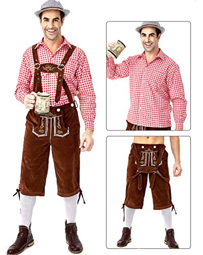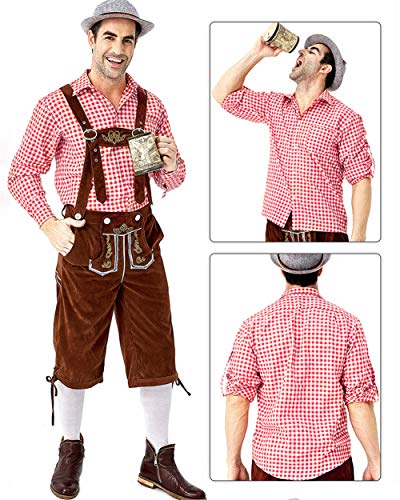 Specificaties: Klederdrachtbroek voor heren, korte lederhose met bandjes, geruit hemd, hoed voor Oktoberfest, rode shirts + bruine Dungarees, 2XL
